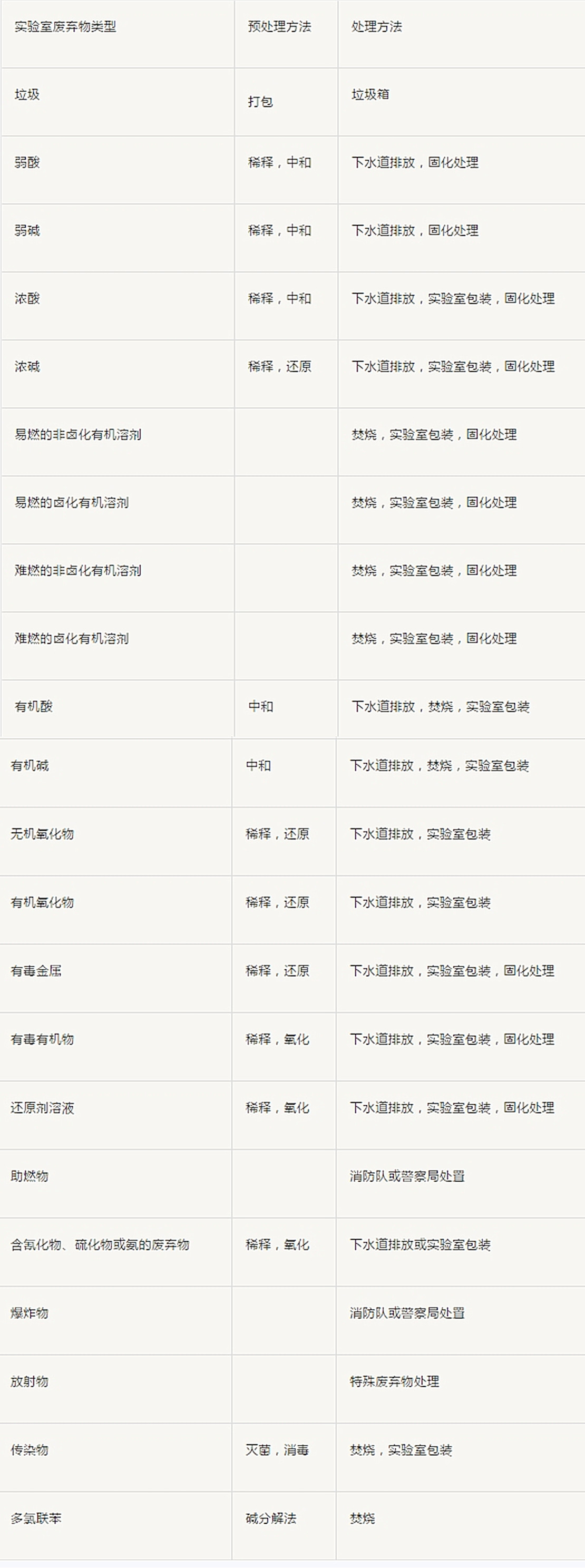 由于实验室废弃物的种类繁多而且数量庞大,因此,对它们的处理也按不同情况采取不同的措施。下面将依次具体介绍废液、废气、固体废弃物等处理的方法。
