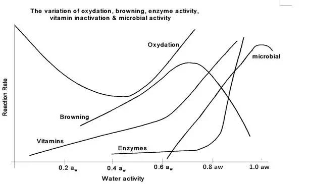 食品中发生的化学反应和酶促反应是引起食品品质变化的重要原因之一,降低食品的水分活度可以延缓酶促褐变和非酶褐变的进行。低水分活度能抑制食品的化学变化,稳定食品质量。