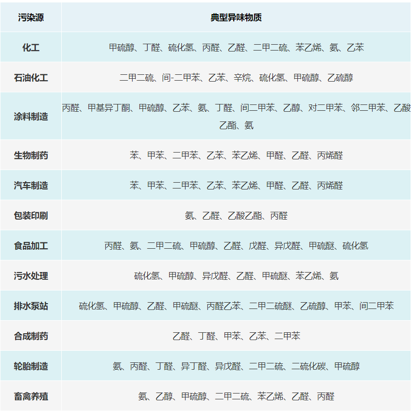 通常工业生产所产生的恶臭物质较为集中,影响较大,典型污染源的主要异味物质如下所示。